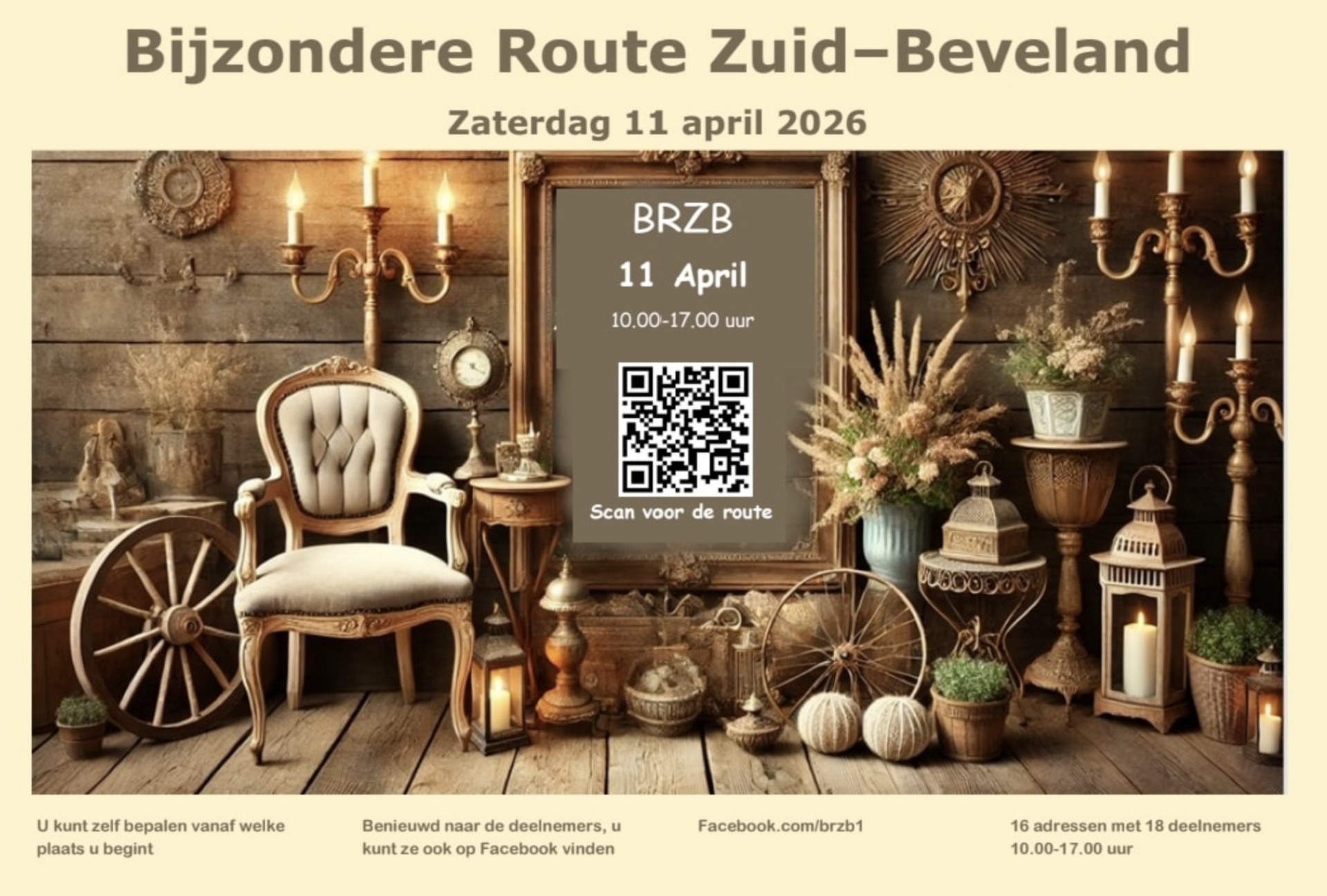 De Bijzondere Route Zuid-Beveland is een halfjaarlijks evenement met verschillende deelnemers. Dit is een route door Zuid Beveland langs allerlei leuke adressen met brocante, vintage of antieke woonaccesoires maar ook leuke tuinornamenten, cadeaus en andere streekproducten. Onderweg zijn ook tussenstops / horeca gelegenheden waar je een heerlijk hapje & drankje kunt scoren om even op te laden.